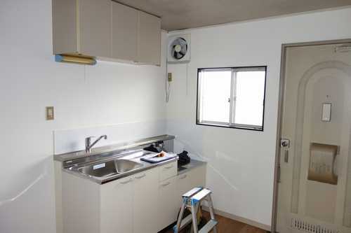 コーポの空き部屋の魅力をUPさせるために、キッチン前面のクロス(壁紙)の張り替えをしました。